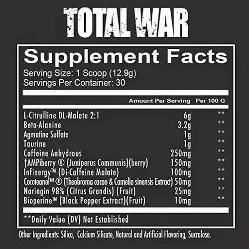 La poderosa combinación de estimulantes y nootrópicos junto con N.O hace que TOTAL WAR sea un pre entreno inigualable.