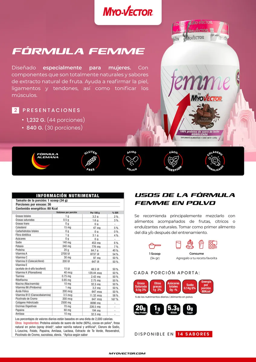 Proteina Myovector Femme 3 Lb Zero Carbs 44 Servicios es una fórmula diseñada para el cuerpo femenino, enfocada en promover un físico esbelto y tonificado. Myo-Vector Femme destaca por su excelente sabor, derivado de ingredientes naturales y extractos de fruta. Este producto contribuye a la firmeza de la piel, ligamentos y tendones, además de tonificar los músculos para un aspecto atlético. Incluye Té Verde, que asiste en la reducción de grasa corporal. Especialmente creada para satisfacer las necesidades nutricionales de la mujer y apoyar en la consecución de sus metas físicas.